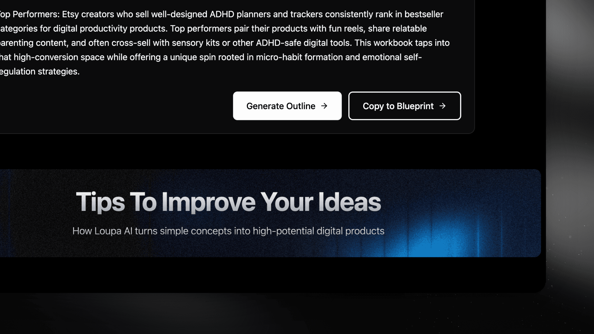 Loupa helps you uncover profitable, creative, and emotionally resonant digital product ideas that actually have a place in today’s market.
